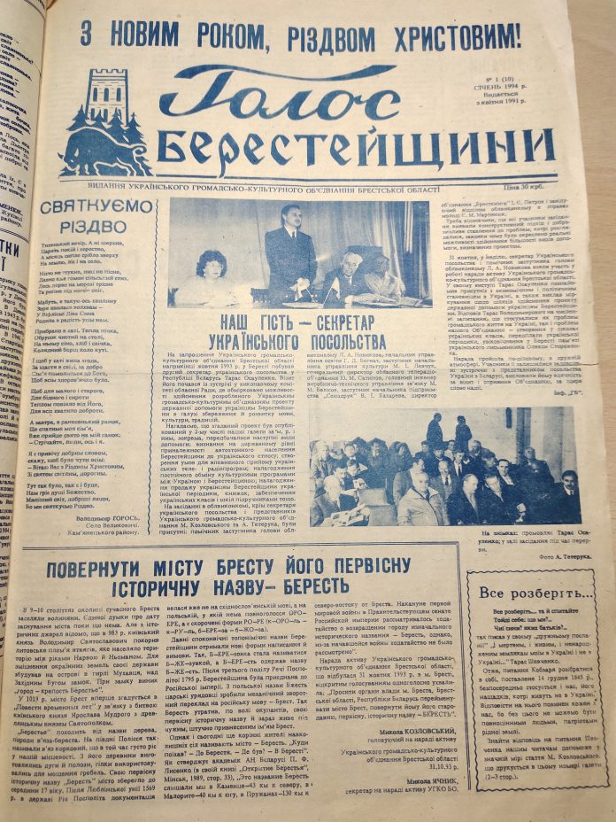 Наиболее системно историческое повествование, сконструированное деятелями украинского этнополитического движения в Беларуси, было изложено в серии статей лидера УОКОБО (организация была основана в 1990 г.) Н.С. Козловского «Еще раз спросим себя: кто мы такие на самом деле?», опубликованных в начале 1994 г. в газете «Голос Брестчины». Автор совершенно необоснованно приписывал современные категории этнополитики явлениям многовековой давности. Изначальный украинский характер Брестского региона, по мнению Н.С. Козловского, объяснялся тем, что на его территории в IX – XI вв. проживали племена волынян (бужан) и древлян – «предков украинского народа, творцов и носителей украинского языка и культуры». Киевская Русь, Галицко-Волынское княжество, в состав которых входили земли Брестчины, именовались «мощными украинскими государствами». По мнению Н.С. Козловского, даже после вхождения Брестского региона в состав Великого княжества Литовского (1341 г.) и Речи Посполитой (1569 г.) он сохранил культурную самостоятельность. Административно-территориальные реформы, проводимые властями Российской империи, в состав которой регион вошел в 1795 г., якобы преследовали цель нивелировать «украинский культурный характер» края. Согласно переписи населения 1897 г., значительная часть жителей края говорила на малорусском диалекте русского языка, что трактовалось Н.С. Козловским как несомненное доказательство их украинской национальной природы. Период 1941–1944 гг. именуется германской оккупацией, но оценивается автором в целом позитивно, так как в то время в регионе, входившем в состав рейхскомиссариата «Украина», было организовано обучение на украинском языке в начальных школах, издавалась украиноязычная газета «Наше слово» [2, с. 2–3].