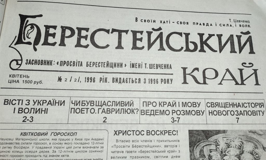 В печатном органе «Просвиты Брестчины» им. Т.Г. Шевченко – газете «Брестский край» – регулярно публиковались материалы, посвященные истории региона. Основное внимание авторы уделяли событиям ХХ в. Многие авторы обращались к данным переписи населения, проводимой властями Польши в 1931 г. в Полесском воеводстве. При этом в текстах активистов украинского этнополитического движения приводились неточные сведения, которым к тому же давалась крайне предвзятая интерпретация. Согласно официальным данным переписи 1931 г., 62,4 % населения назвали родным языком «местный» («тутэйшы») язык, 14,5 %; – польский, 10 % – идиш, 6,7 % – белорусский, 4,8 % – украинский, 1,4 % – русский [6, s. 20]. В одной из статей «Брестского края» (автор – А. Мартынов) сообщалась ложная информация, согласно которой более 20 % населения в ходе переписи 1931 г. назвало родным языком украинский. «Малосознательные в национальном отношении полешуки» (так автор материала охарактеризовал лиц, назвавших родным «местный» язык) также автоматически трактовались как украинцы. В результате данных логических манипуляций А. Мартынов делал вывод, согласно которому якобы 80 % жителей Брестчины даже в условиях репрессивной политики властей межвоенной Польши сохраняли украинскую идентичность [7, с. 2].