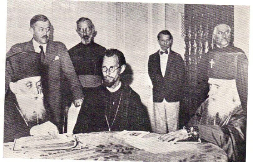 Письмо было «запечатано большой печатью на красном воске. На печати было несколько слов, крестов и знаков, значения которых Обркнежевич не знал» [22]. Письмо, однако, достигло своей цели: когда он прочитал его и осознал уровень полномочий, которые он будет иметь в качестве главы ХПЦ, Гермоген принял решение и отправился в Загреб, где уже была основана церковная община ХПЦ с Петром Лазичем во главе. Когда Гермоген 4 июня 1942 г. , прибыл в Загреб, дела пошли своим чередом: 5 июня 1942 г. Павелич принял Гермогена, который принёс присягу ему и НГХ [23] и 6 июня в присутствии Павелича был торжественно введён в должность.