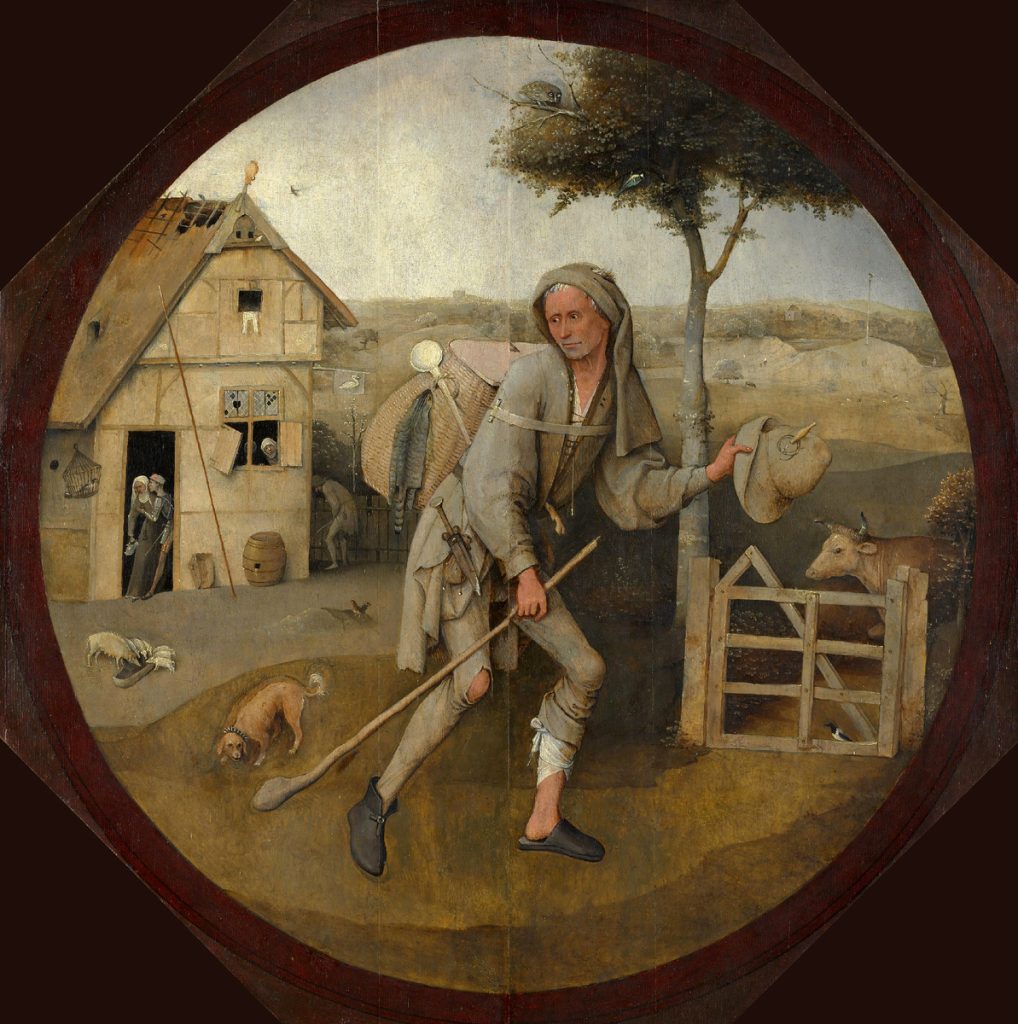 Босх изобразил оборванного измождённого странника, то ли покинувшего кабак, то ли остановившегося в раздумье: оставлять это место или, всё-таки, вернуться. Приглушённый охристый колорит хорошо передаёт атмосферу пасмурного дня. Но мы с вами знаем, что Иероним Босх – известный мастер ребусов. Поэтому посмотрим повнимательнее: что означают символы, изображённые на картине.