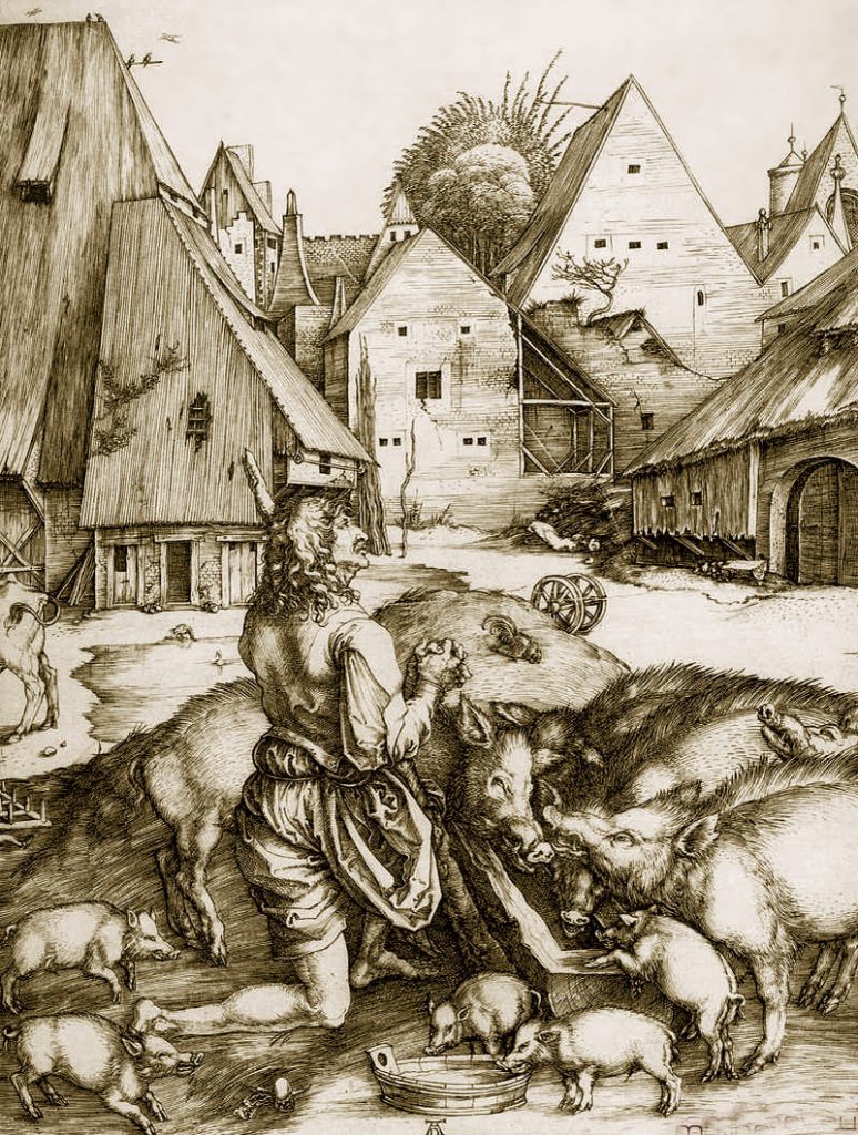 На гравюре Альбрехта Дюрера блудный сын, в окружении свиней. Он встал на колени, сжал молитвенно руки и обращается ко Спасителю.