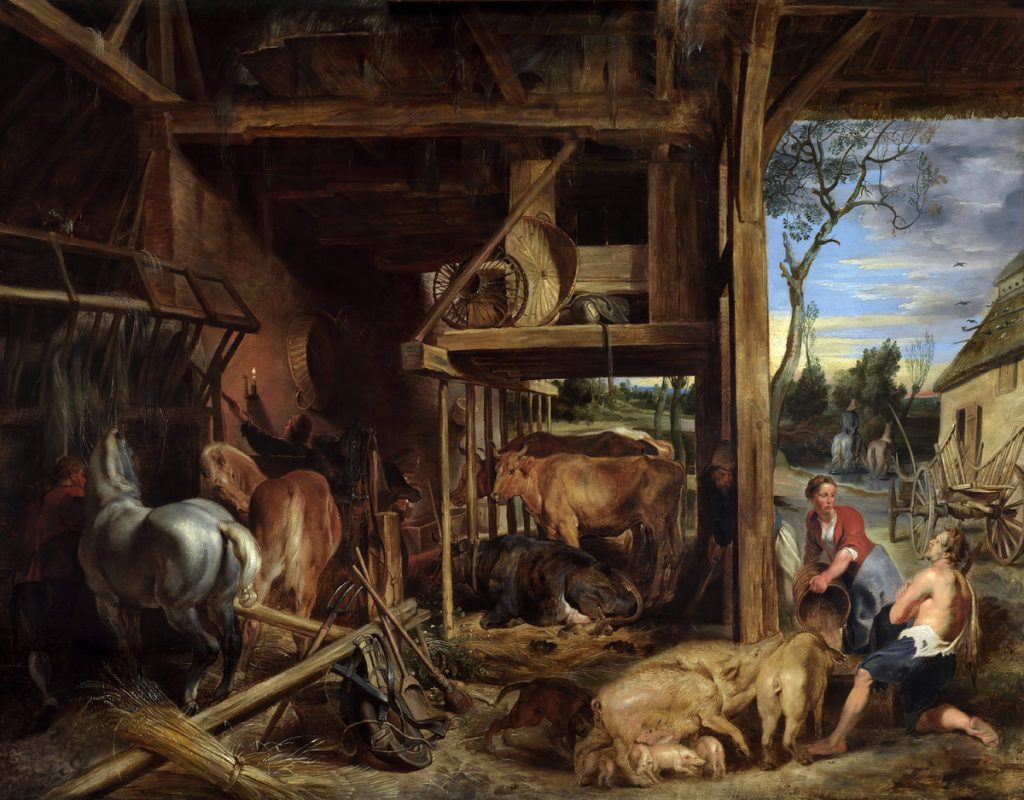 Хотя, возможно, заказчиков не устроила работа, ибо перед нами живописуются вовсе не страдания промотавшегося блудника, как это принято было у протестантов, не молитвенный экстаз кающегося грешника, как это было принято в «католическом формате», но… Но какая-то почти пасторальная картина, живописующая прочное хозяйство, сытых коней, коров и свиней. Крепкий добротный сарай…
