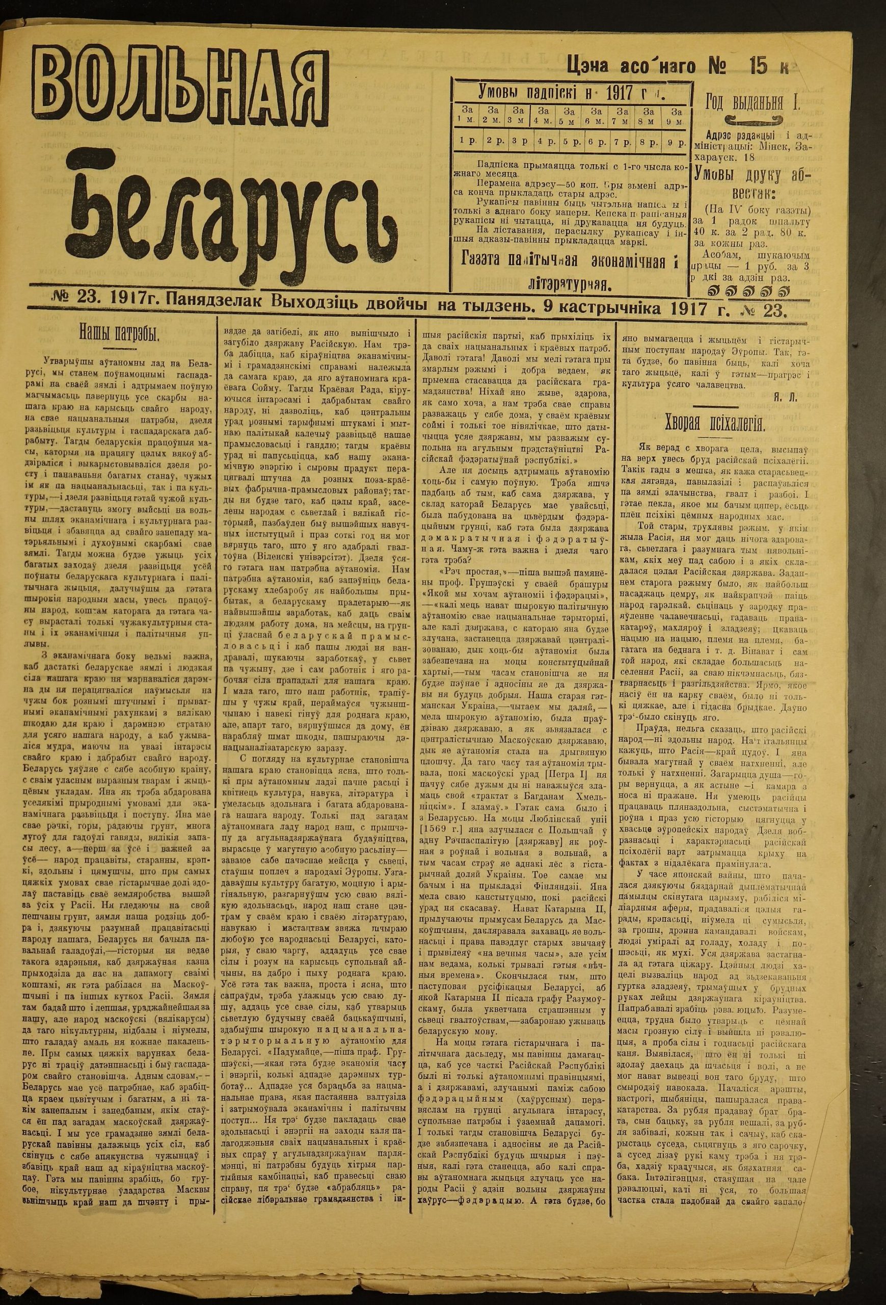- Я. Л – к Нашы патрэбы // Вольная Беларусь. 1917. № 20. С. 1.