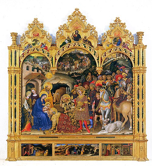 На знаменитом алтарном образе мастера готического искусства Джентило да Фабриано (1370-1427) мы видим, что из гардероба волхвов исчезают восточные головные уборы, место которых занимают королевские короны. Средневековая культура начинает именовать «магов» «королями».