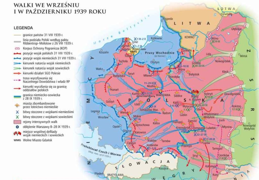 Любопытно визуальное оформление военно-политических событий сентября 1939 года. Историческая карта из действующего учебника формирует представление о том, что на Польшу напали с двух сторон, причем нацистская Германия и СССР предстают в качестве равноценных противников для Польши. В рассуждениях о причинах военного поражения утверждается, что «советское нападение 17 сентября сделало невозможным дальнейшую оборону с использованием румынского предмостного укрепления, куда могла попасть военная помощь от союзников» [1, s. 17]. Последовательно проводится отождествление нацистской Германии и СССР, которые не только везде именуются агрессорами, но ставится знак равенства между ними как военными преступниками. Утверждается, что Вермахт, как и Красная армия, совершали «военные преступления» [1].